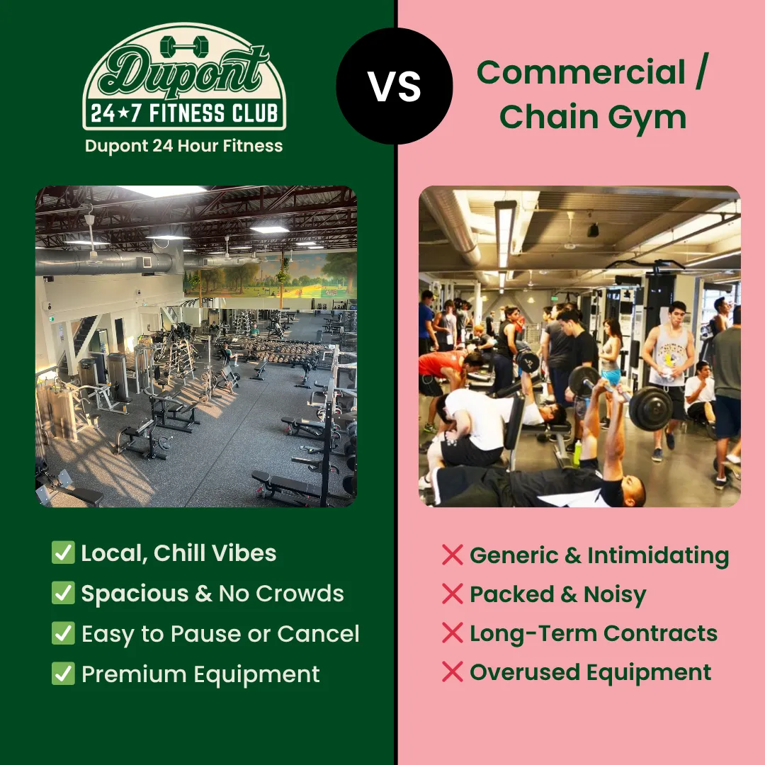 Big chains are all the same. Packed spaces, overused equipment, and that generic meat-head vibe that kills motivation. Plus the fine print that locks you in. You deserve a clean, welcoming space that actually helps you make progress.